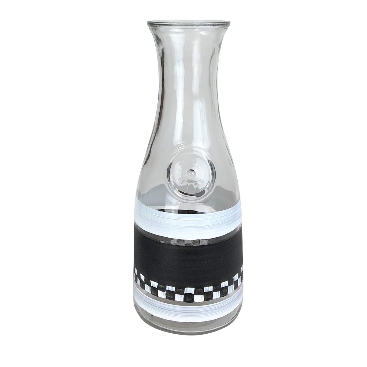 This carafe set features black and white checks bordering black chalk paint. A great way to personalize all of the special days of your life. Also, a perfect gift for any occasion. Be creative!! Proudly hand painted in the USA by American Artists. Please hand wash.