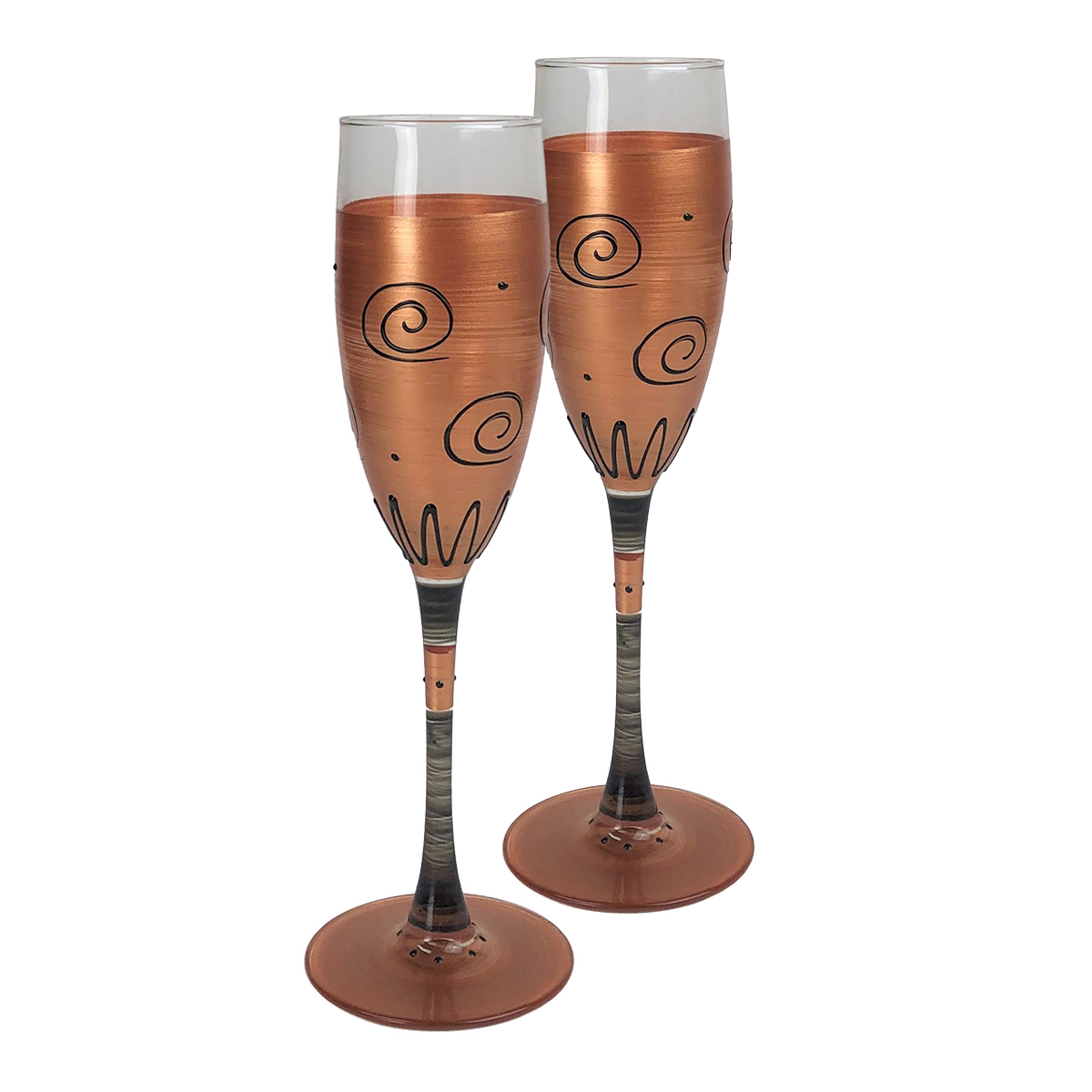 Each of our champagne flute glasses are unique and special. Carefully and lovingly hand painted by the Artistic Team at Golden Hill Studio. This handsome collection is vermeil gold and accented with black curls and dots. We think it has a 'lodge' feel to it but really suits any decor. A very elegant collection! Golden Hill Studio is not just about fine glassware but about fine living! The studio is in a farmhouse that dates to the 1860's on 100 acres of peaceful and serene country side. A daily inspiration to beauty and nature. All photography is done either inside Golden Hill's beautifully restored farmhouse or outside in the extensive and lovely gardens!! Please hand wash.