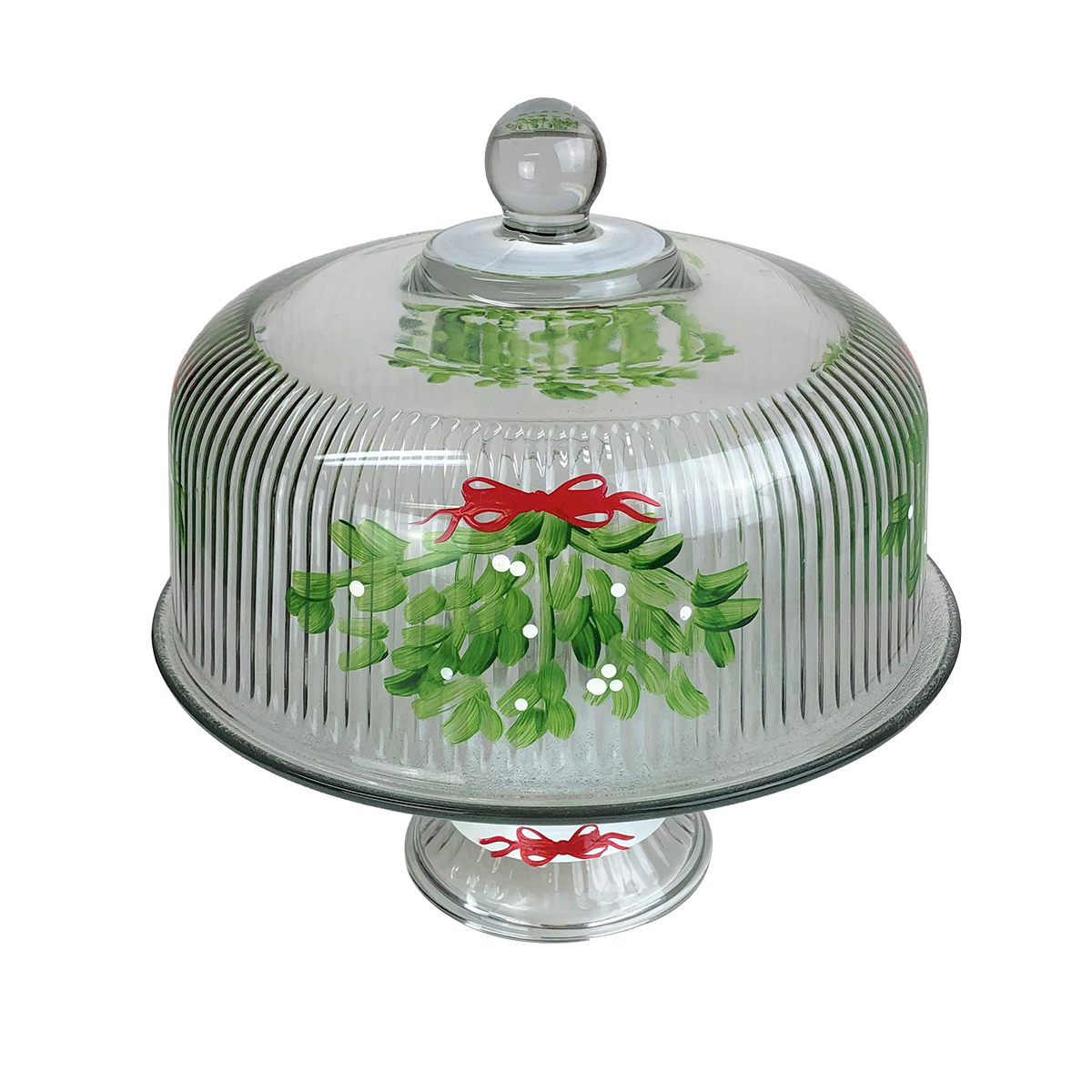 Each of our cake domes are unique and special. Carefully and lovingly hand painted by the Artistic Team at Golden Hill Studio. Our Mistletoe Collection features pretty red berries on mistletoe branches and will make holiday celebrations very special! Put it over that special person's head for a Mistletoe Kiss! Golden Hill Studio is not just about fine glassware but about fine living! Please Hand Wash