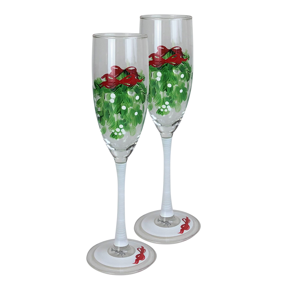 | Each of our champagne glasses are unique and special. Carefully and lovingly hand painted by the Artistic Team at Golden Hill Studio. Our Mistletoe Collection features pretty red berries on mistletoe branches and will make holiday celebrations very special! Put it over that special person's head for a Mistletoe Kiss! Golden Hill Studio is not just about fine glassware but about fine living! |