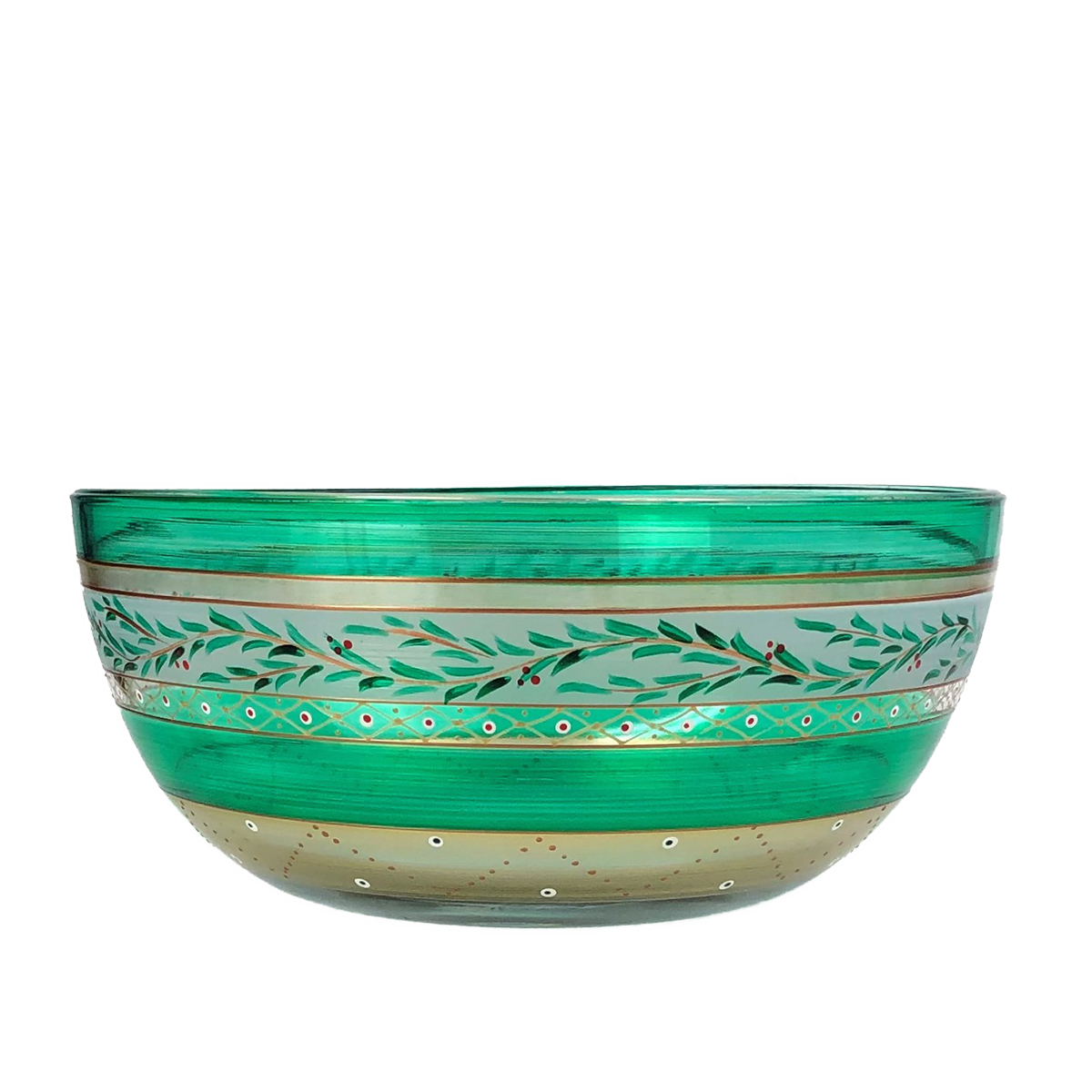 Each of our 11" serving salad bowls are unique and special. Carefully and lovingly hand painted by the Artistic Team at Golden Hill Studio. Our Moroccan Mosaic Forest Collection features a pretty green garland. And is so lovely and fun and dresses up any event. Golden Hill Studio is not just about fine glassware but about fine living! The studio is in a farmhouse that dates to the 1860's on 100 acres of peaceful and serene country side. A daily inspiration to beauty and nature. All photography is done either inside Golden Hill's beautifully restored farmhouse or outside in te extensive and lovely gardens!! Please hand wash.