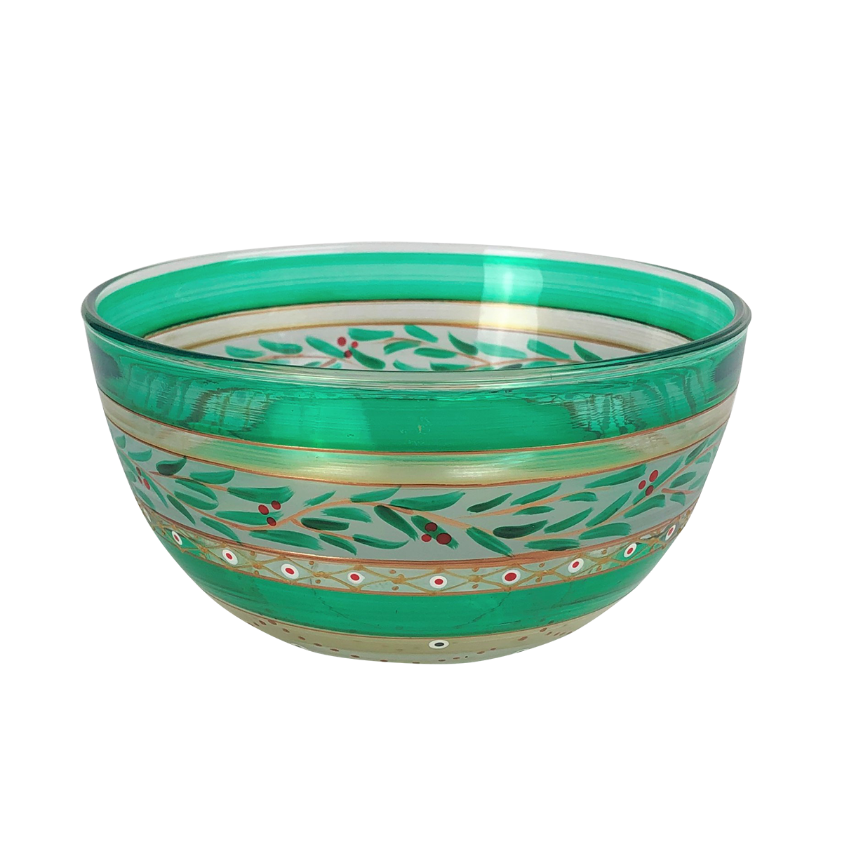 Each of our 6" serving bowl are unique and special. Carefully and lovingly hand painted by the Artistic Team at Golden Hill Studio. Our Moroccan Mosaic Forest Collection features a pretty green garland. And is so lovely and fun and dresses up any event. Golden Hill Studio is not just about fine glassware but about fine living! The studio is in a farmhouse that dates to the 1860's on 100 acres of peaceful and serene country side. A daily inspiration to beauty and nature. All photography is done either inside Golden Hill's beautifully restored farmhouse or outside in the extensive and lovely gardens!! Please hand wash.