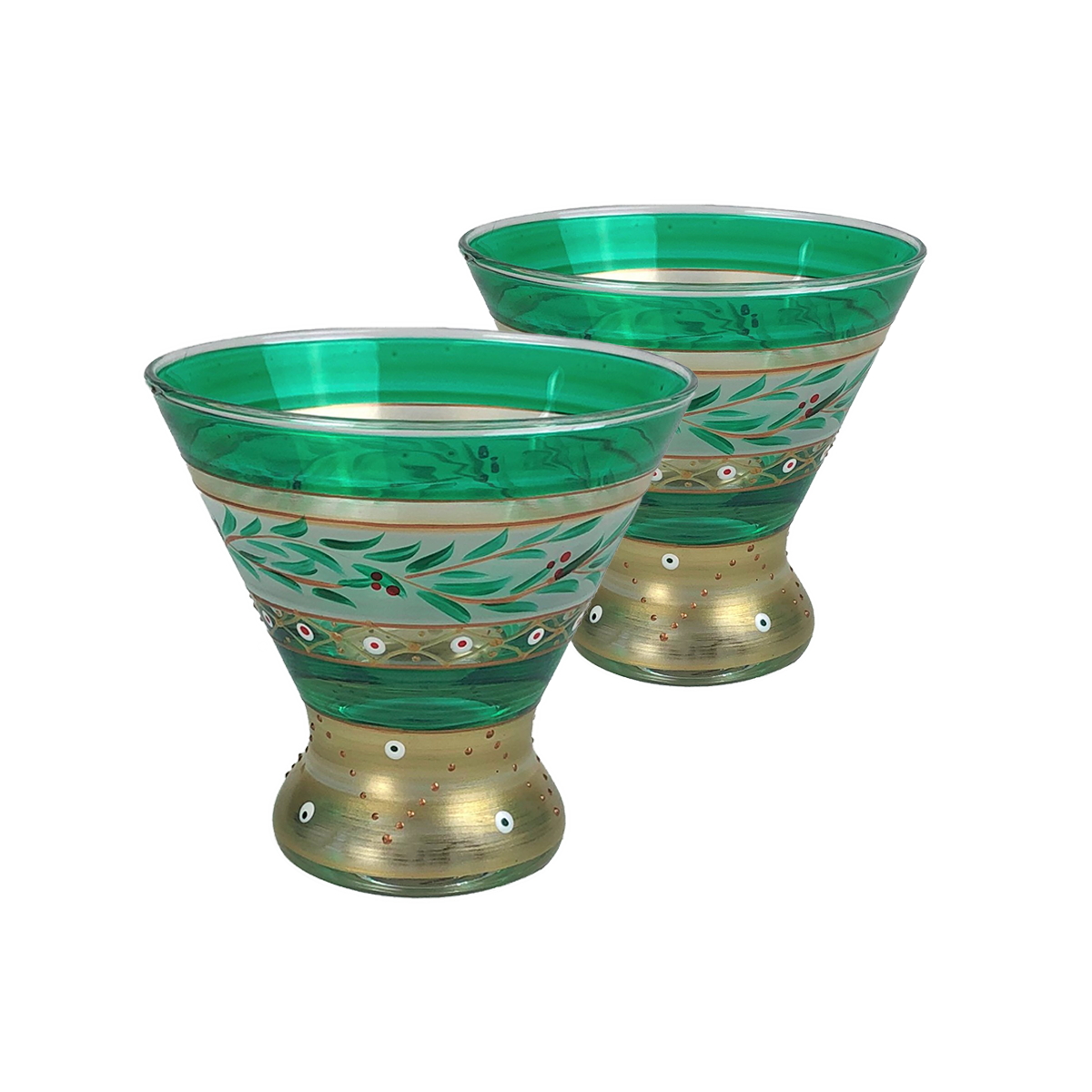 Each of our cosmopolitan glasses are unique and special. Carefully and lovingly hand painted by the Artistic Team at Golden Hill Studio. Our Moroccan Mosaic Forest Collection features a pretty green garland. And is so lovely and fun and dresses up any event. Golden Hill Studio is not just about fine glassware but about fine living! The studio is in a farmhouse that dates to the 1860's on 100 acres of peaceful and serene country side. A daily inspiration to beauty and nature. All photography is done either inside Golden Hill's beautifully restored farmhouse or outside in the extensive and lovely gardens!! Please hand wash.