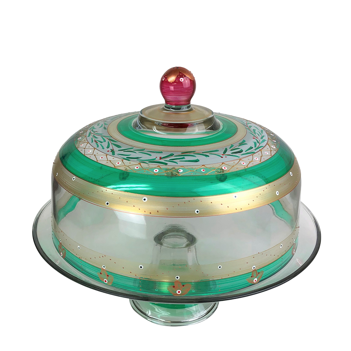 Each of our cake dome are unique and special. Carefully and lovingly hand painted by the Artistic Team at Golden Hill Studio. Our Moroccan Mosaic Forest Collection features a pretty green garland. And is so lovely and fun and dresses up any event. Golden Hill Studio is not just about fine glassware but about fine living! The studio is in a farmhouse that dates to the 1860's on 100 acres of peaceful and serene countryside. A daily inspiration to beauty and nature. All photography is done either inside Golden Hill's beautifully restored farmhouse or outside in the extensive and lovely gardens!! Please hand wash.