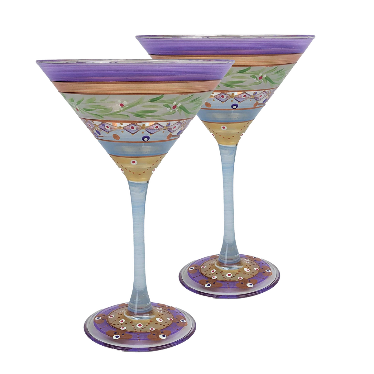 Each of our martini glasses are unique and special. Carefully and lovingly hand painted by the Artistic Team at Golden Hill Studio. Our Moroccan Mosaic Lilac Collection features a pretty green garland. And is so lovely and fun and dresses up any event. Golden Hill Studio is not just about fine glassware but about fine living! The studio is in a farmhouse that dates to the 1860's on 100 acres of peaceful and serene country side. A daily inspiration to beauty and nature. All photography is done either inside Golden Hill's beautifully restored farmhouse or outside in the extensive and lovely gardens!! Please hand wash.