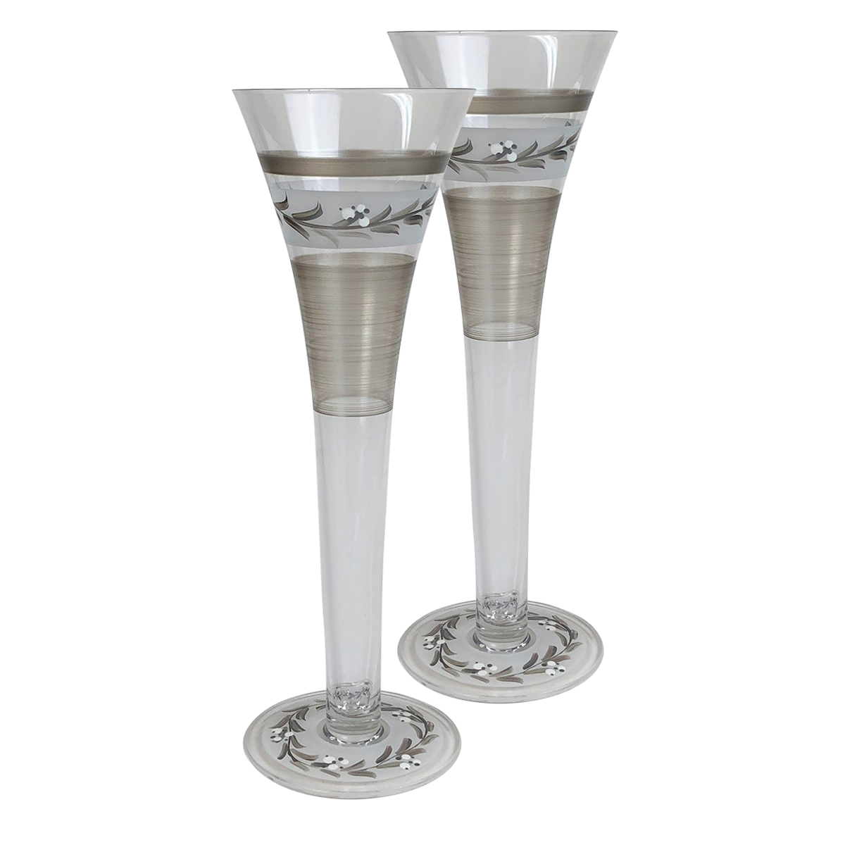 Each of our hollow flute champagne are unique and special. Carefully and lovingly hand painted by the Artistic Team at Golden Hill Studio. Our Swiss Twilight Collection is accented with a pretty pewter vine. And is so lovely and fun and dresses up any event. Golden Hill Studio is not just about fine glassware but about fine living! The studio is in a farmhouse that dates to the 1860's on 100 acres of peaceful and serene country side. A daily inspiration to beauty and nature. All photography is done either inside Golden Hill's beautifully restored farmhouse or outside in the extensive and lovely gardens!! Please hand wash.