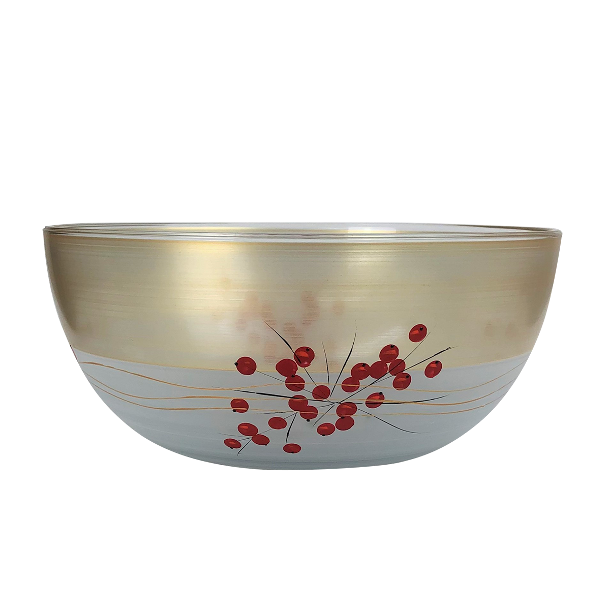 Each of our 11" serving salad bowls are unique and special. Carefully and lovingly hand painted by the Artistic Team at Golden Hill Studio. Our Winter Berries 'n Branches Collection features pretty red berries on branches and will make holiday celebrations very special but any day of the year as well! Golden Hill Studio is not just about fine glassware but about fine living! The studio is in a farmhouse that dates to the 1860's on 100 acres of peaceful and serene countryside. A daily inspiration to beauty and nature. All photography is done either inside Golden Hill's beautifully restored farmhouse or outside in the extensive and lovely gardens!! Please hand wash.
