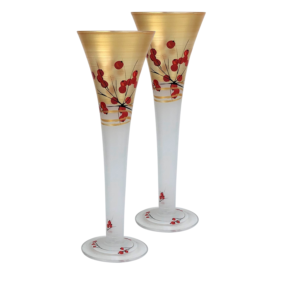 Each of our hollow flute champagne are unique and special. Carefully and lovingly hand painted by the Artistic Team at Golden Hill Studio. Our Winter Berries 'n Branches Collection features pretty red berries on branches and will make holiday celebrations very special but any day of the year as well! Golden Hill Studio is not just about fine glassware but about fine living! The studio is in a farmhouse that dates to the 1860's on 100 acres of peaceful and serene countryside. A daily inspiration to beauty and nature. All photography is done either inside Golden Hill's beautifully restored farmhouse or outside in the extensive and lovely gardens!! Please hand wash.
