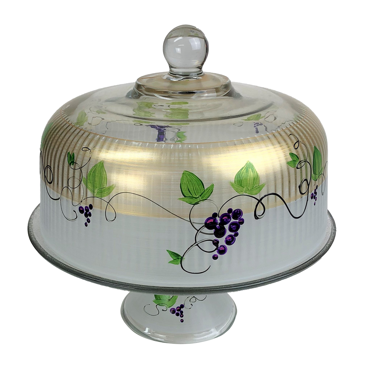 Each of our cake dome are unique and special. Carefully and lovingly hand painted by the Artistic Team at Golden Hill Studio. Our Napa Grapes n' Vines Collection features a pretty bunch of grapes on their vines....just waiting to be harvested! Golden Hill Studio is not just about fine glassware but about fine living! The studio is in a farmhouse that dates to the 1860's on 100 acres of peaceful and serene country side. A daily inspiration to beauty and nature. All photography is done either inside Golden Hill's beautifully restored farmhouse or outside in the extensive and lovely gardens!! Please hand wash.