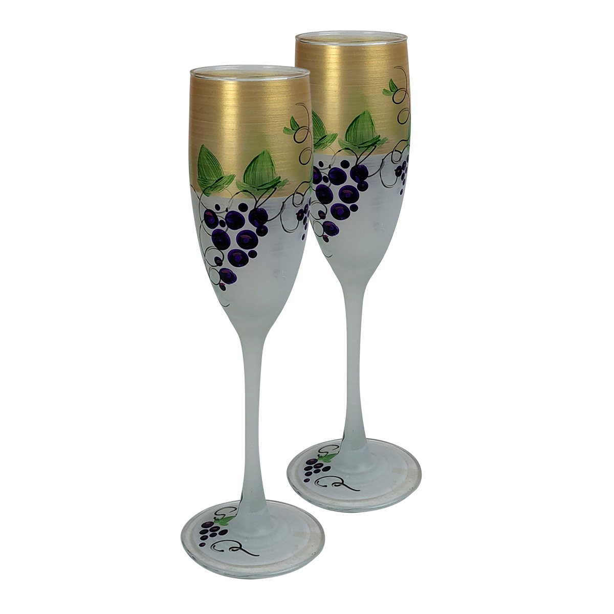 Each of our champagne flute glasses are unique and special. Carefully and lovingly hand painted by the Artistic Team at Golden Hill Studio. Our Napa Grapes n' Vines Collection features a pretty bunch of grapes on their vines....just waiting to be harvested! Golden Hill Studio is not just about fine glassware but about fine living! The studio is in a farmhouse that dates to the 1860's on 100 acres of peaceful and serene country side. A daily inspiration to beauty and nature. All photography is done either inside Golden Hill's beautifully restored farmhouse or outside in the extensive and lovely gardens!! Please hand wash.