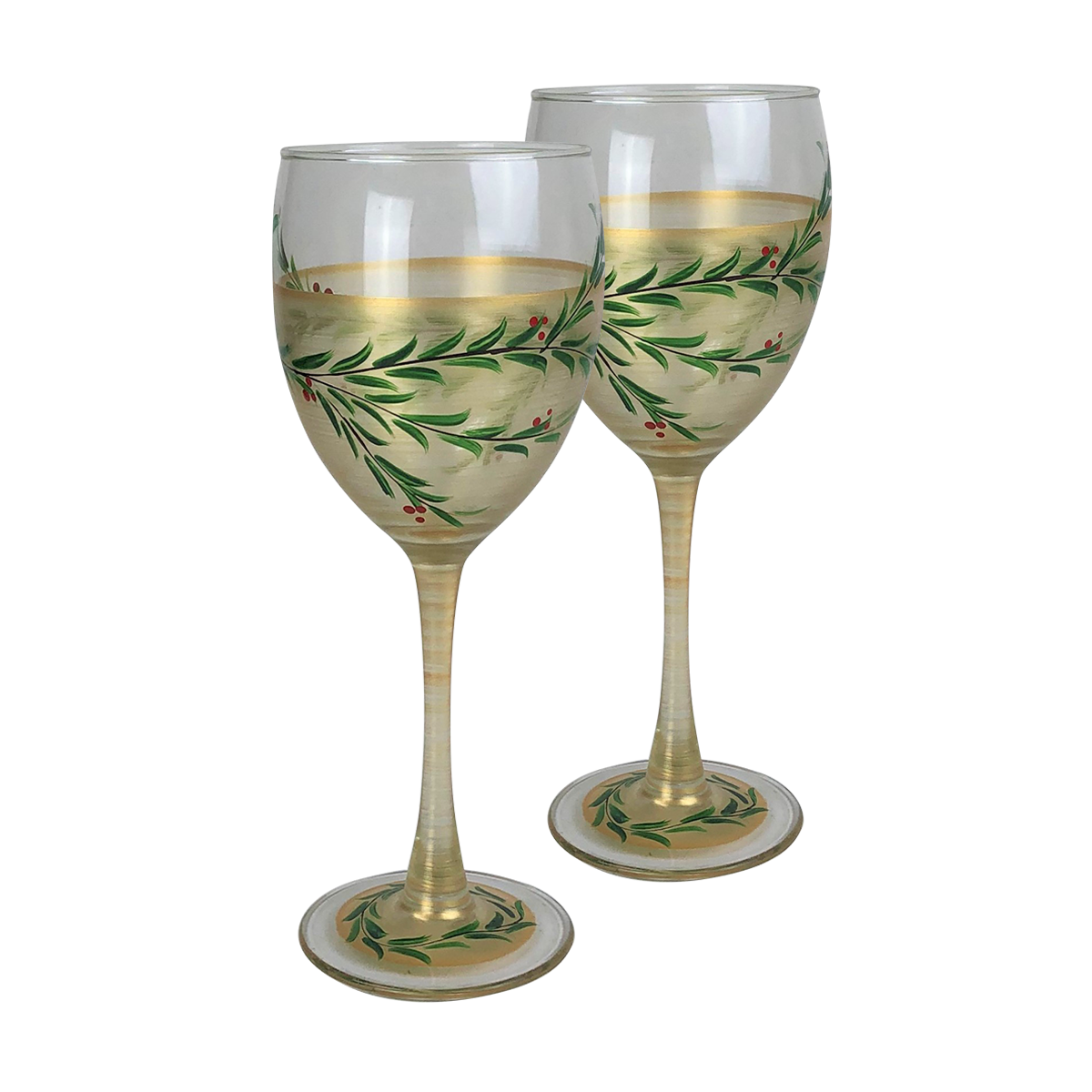 Each of our wine glasses are unique and special. Carefully and lovingly hand painted by the Artistic Team at Golden Hill Studio.   Put it over that special person's head for a Mistletoe Kiss! Golden Hill Studio is not just about fine glassware but about fine living!