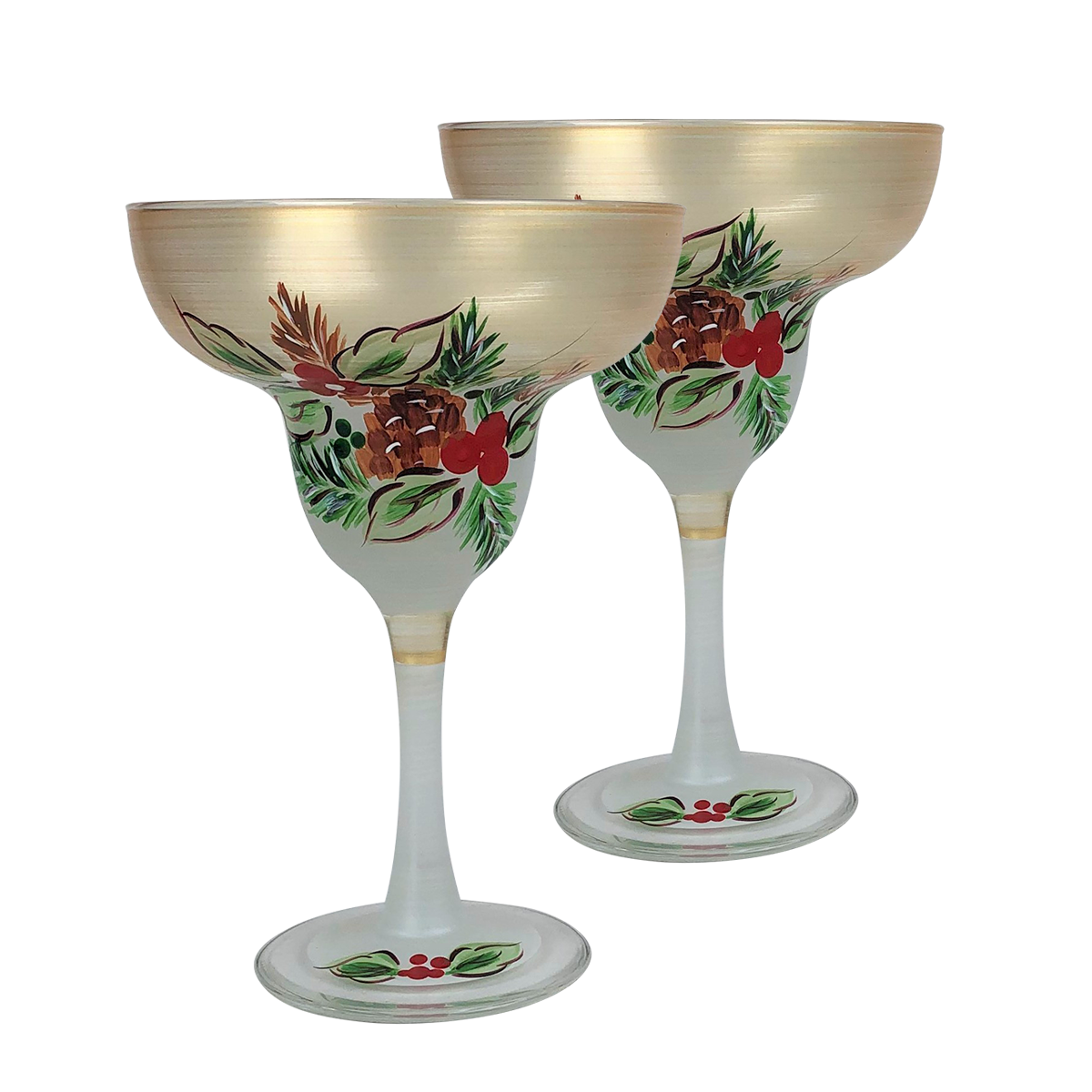 | Each of our margarita glasses are unique and special. Carefully and lovingly hand painted by the Artistic Team at Golden Hill Studio. Our Black Forest Pine Collection features pretty pine cones and red berries on a pine bough. A great way to celebrate the holidays and all winter through! Golden Hill Studio is not just about fine glassware but about fine living! |